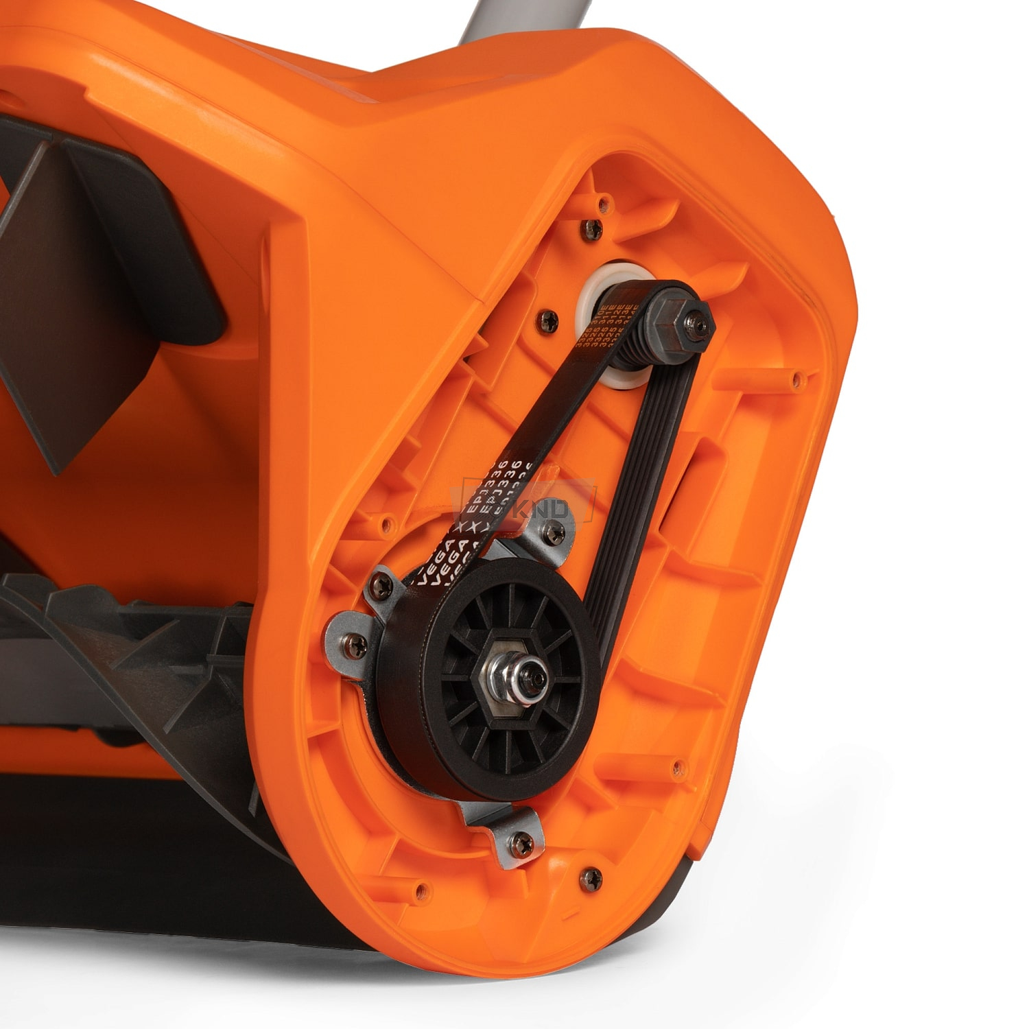 Ременный привод обеспечивает надежную передачу крутящего момента от двигателя к шнеку, одновременно защищая мотор от перегрузок и повреждений в случае застревания или блокировки шнекового механизма.