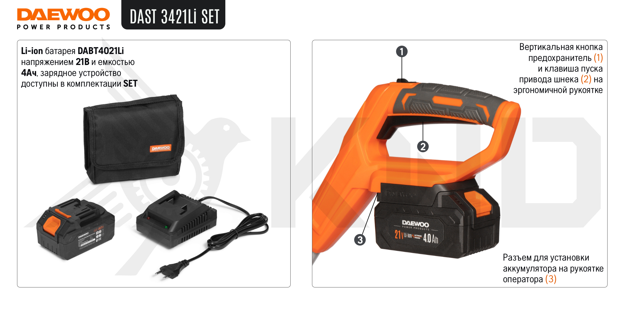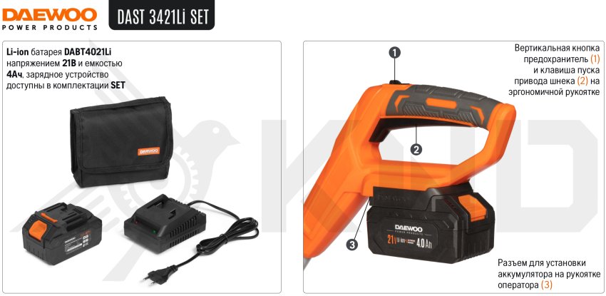 Модель совместима со всеми аккумуляторными инструментами и батареями DAEWOO линейки 21В.