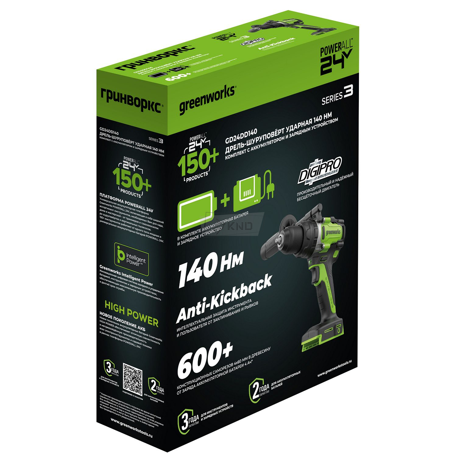Дрель-шуруповерт аккумуляторная Greenworks GD24DD140 с 2 АКБ 4 Ач и ЗУ