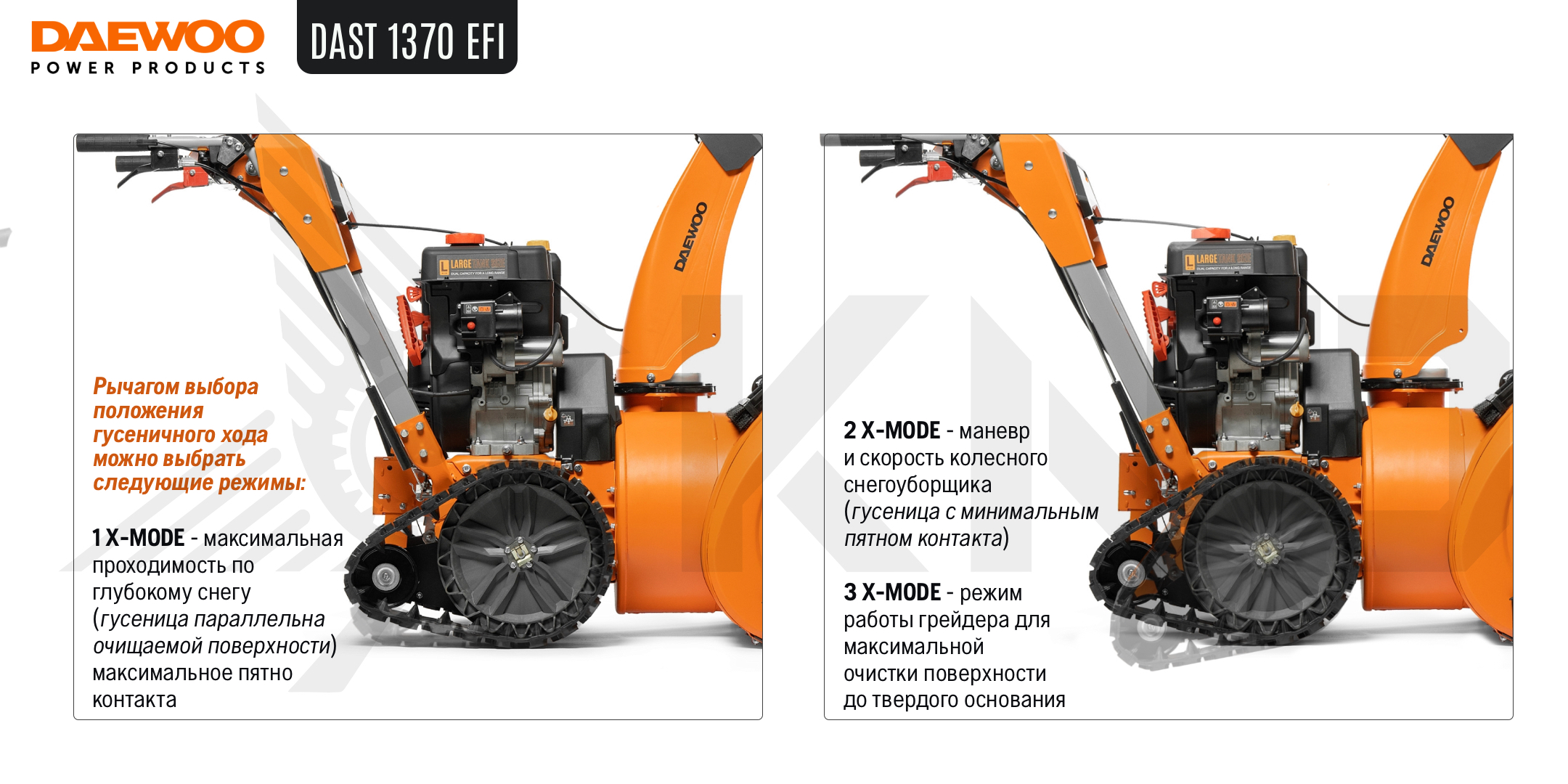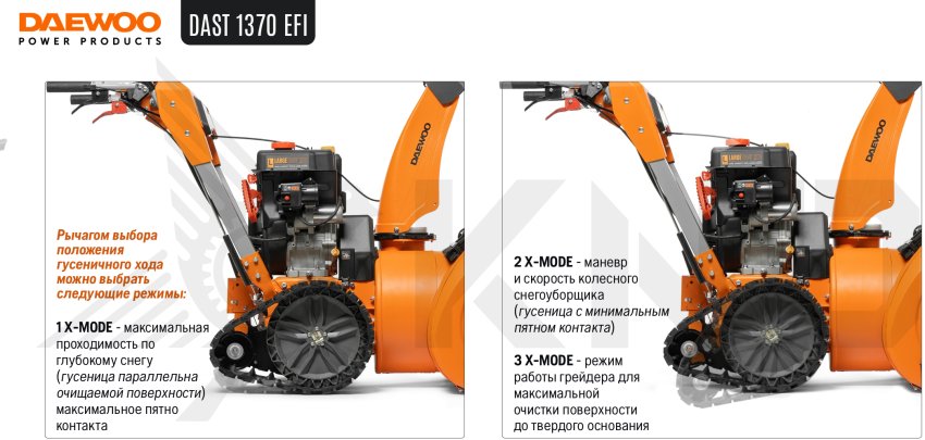 3 положения работы гусениц: 1Х MODE максимальная проходимость в глубоком снегу и в горах. 2Х MODE маневренность и скорость работы колесного снегоуборщика. 3Х MODE режим работы грейдера для очистки поверхности до основания.