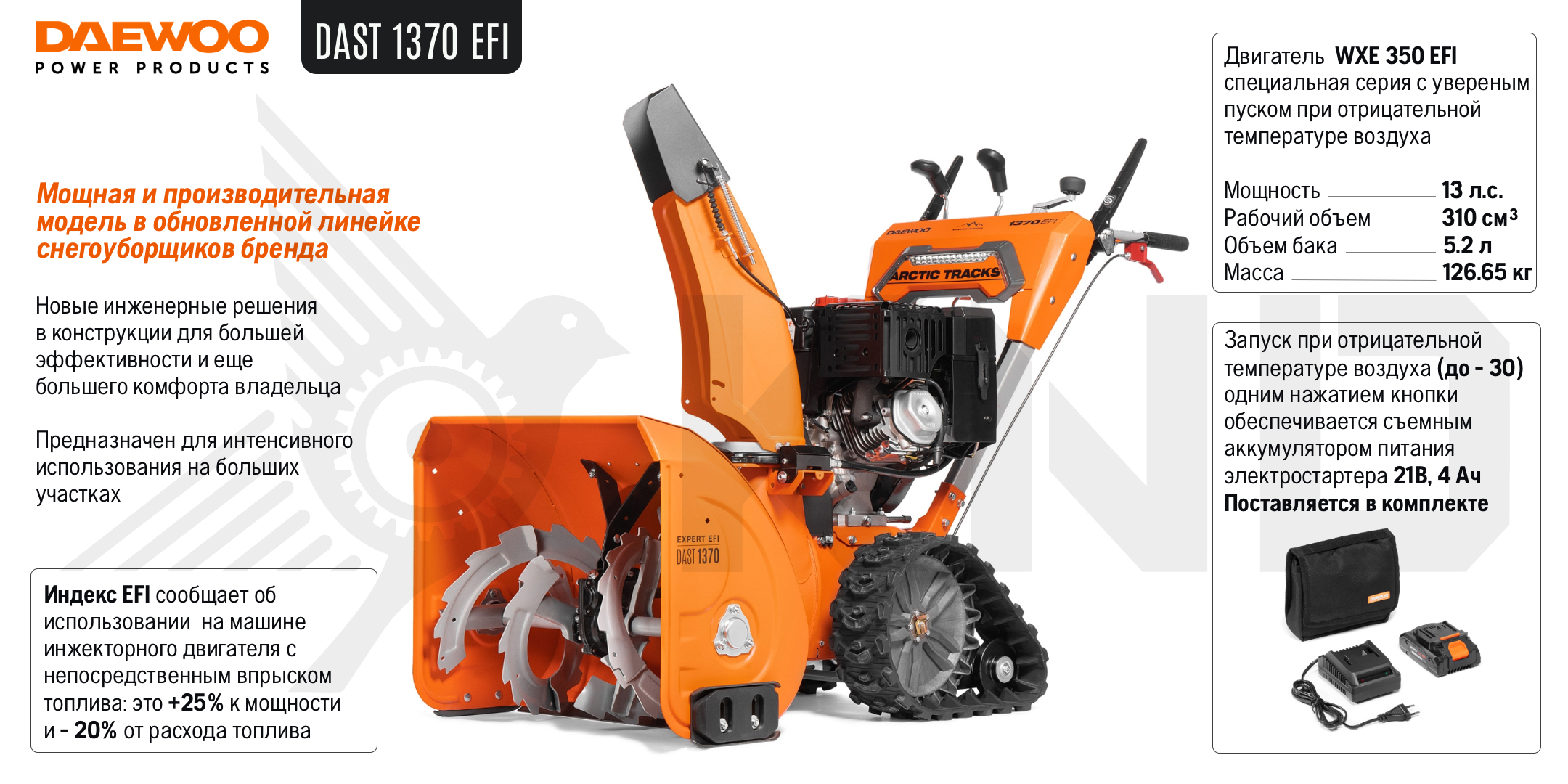 Уверенный запуск при отрицательных температурах. Повышенный моторный ресурс. Увеличенный глушитель и сниженный уровень шума. Вместительный топливный бак на 5,2 литра.