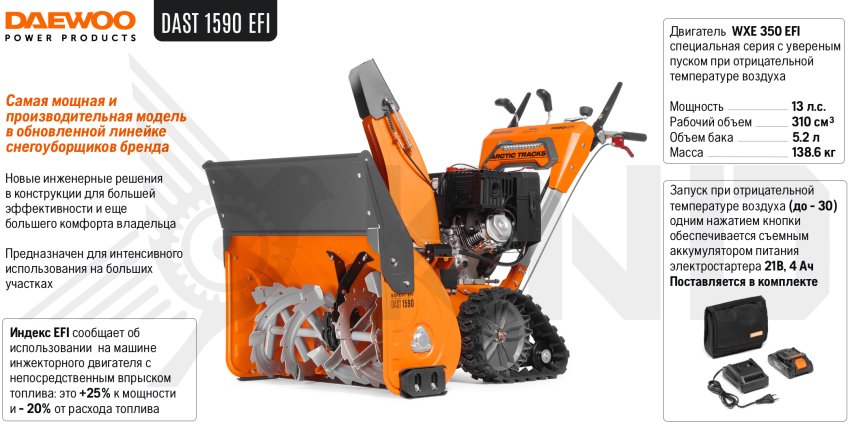 Инновационный двигатель WXE 350 EFI с системой непосредственного впрыска топлива разработан специально для снегоуборщиков. Обладает увеличенной до 25% мощностью и сниженным до 20% расходом топлива по сравнению с карбюраторными моделями.
