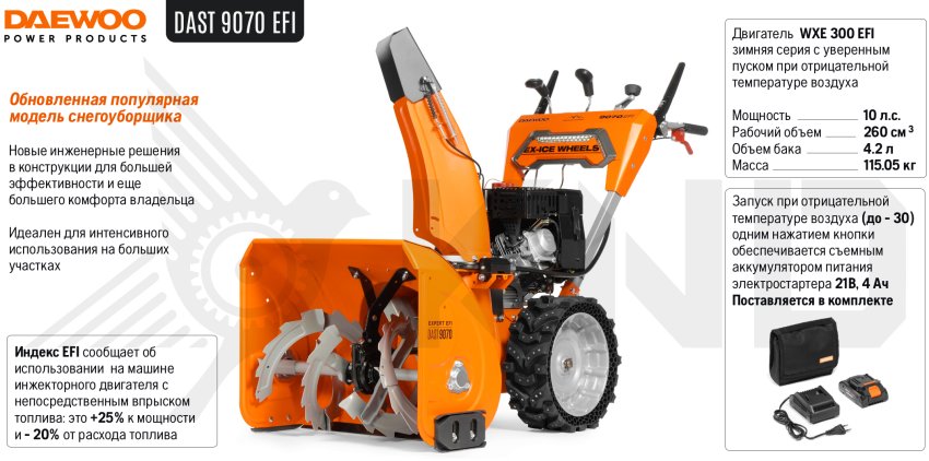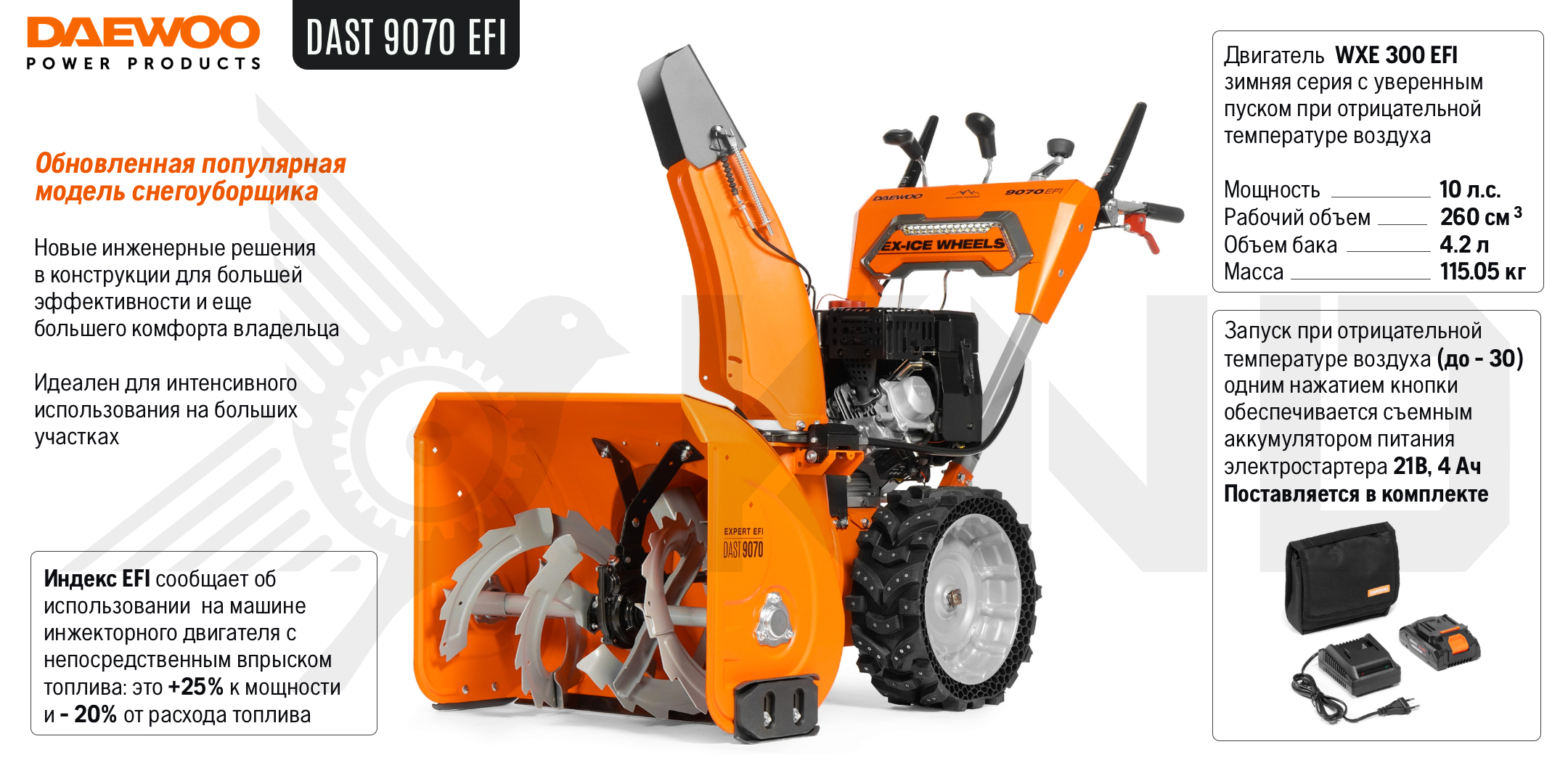 Инновационный двигатель WXE 300 EFI с системой непосредственного впрыска топлива разработан специально для снегоуборщиков. Обладает увеличенной до 25% мощностью и сниженным до 20% расходом топлива по сравнению с карбюраторными моделями.