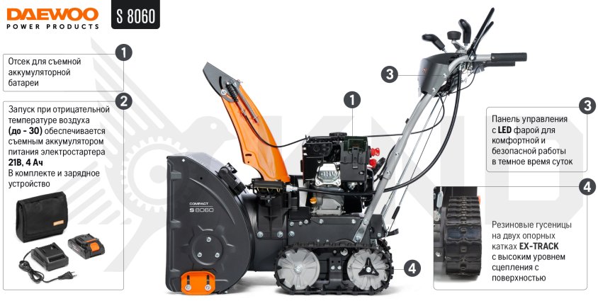 Запуск двигателя путем нажатия кнопки Start. Питание от аккумулятора DAEWOO 21 В. Легкий запуск в любые морозы и возможность использования аккумулятора с инструментом линейки DAEWOO 21В.