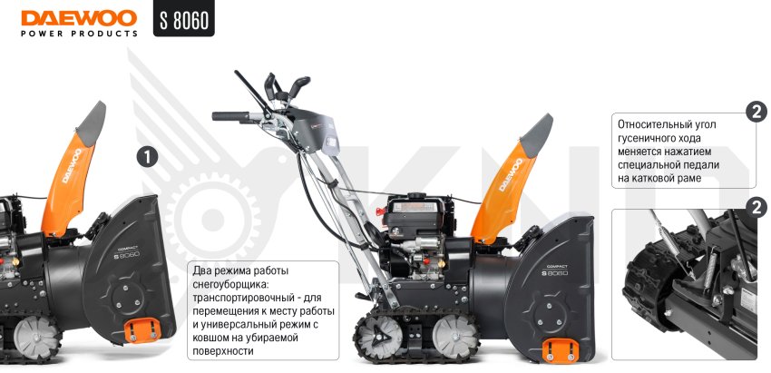 Транспортировочный режим - для перемещения снегоуборщика во внерабочем положении, и универсальный режим - основной вес снегоуборщика приходится на гусеницы.