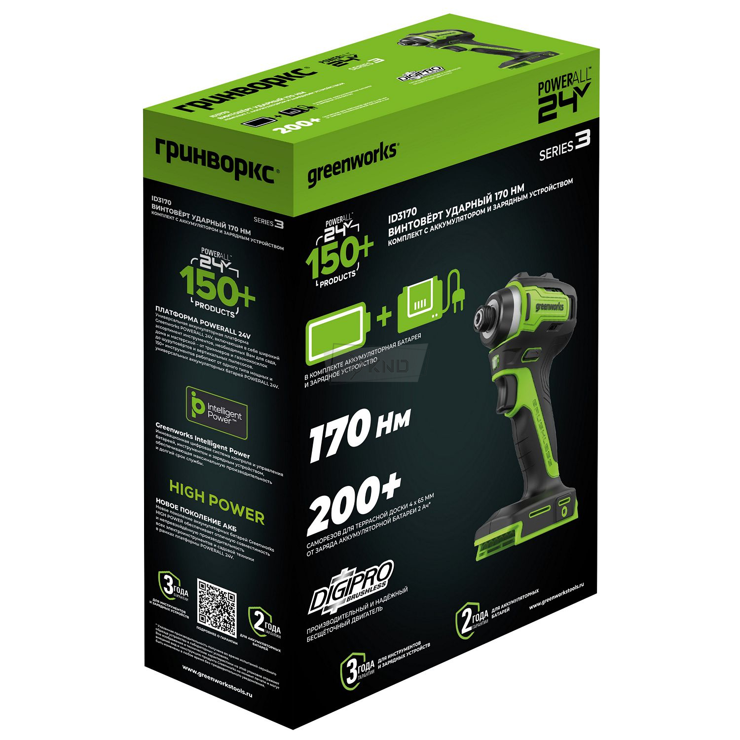 Винтоверт ударный аккумуляторный Greenworks ID3170, с АКБ 2 Ач и ЗУ